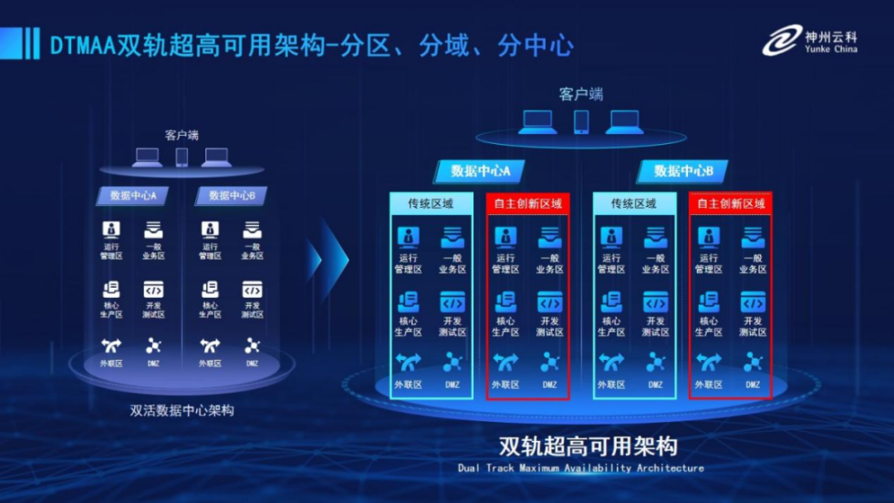 为帮助金融客户更好地应对数字经济时代对可持续性的高要求,实现“信创”与“数字化”齐头并进,mile米乐M6推出了双轨超高可用架构。该架构在双活数据中心的分区调度基础上,增加信创域和非信创域的分域调度,实行信创域与传统域应用全量部署,使双中心运营变为双中心四区域并行运行,互为多活,将“0到1”的单轨建设道路变为分区分域协同的多活双轨超高可用架构。帮助客户在新架构下,保障“信创”的同时解决性能瓶颈,提升稳定性,保证应用可持续性,最终实现信创区域和非信创区域的平滑过渡,完成国产化替代目标。